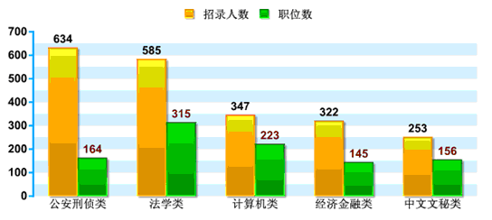 本次考录共有626个职位对专业无限制,占总数的26%,共招录1975人。中公教育对本次考试热门专业进行了统计,发现今年一如往年,公安刑侦类专业需求量较大,法学类、计算机等需求量也不小。下图供考生参考。中公教育老师建议考生在报考职位时要选择与自身条件最为匹配的职位。