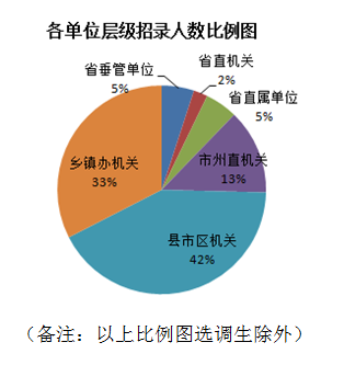 从单位层级来看,县市区招录人数为本次招录大户,有42%的人员为县市区招录,其次为乡镇办机关,招录人数占33%,省直机关招录人数最少,占2%。