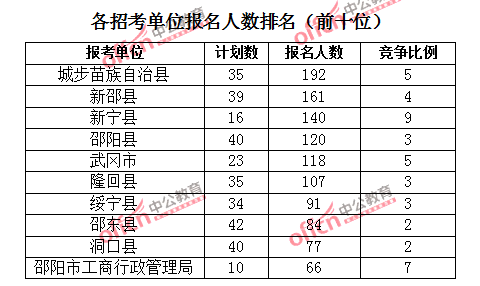 为帮助广大考生更清晰的了解报名情况,中公教育整理了邵阳市各招考单位的报名人数排名以及竞争比例排名,供广大考生参考: