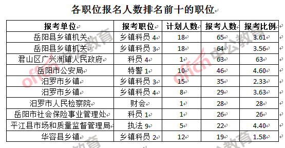 为帮助广大考生更清晰的了解报名情况,中公教育整理了岳阳市各职位的报名人数排名以及竞争比例排名,供广大考生参考: