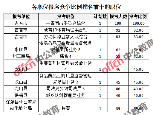 竞争热门职位,前三位依次是:吉首市共青团市委员会综合(竞争比例190:1)、吉首市教育和体育局档案管理(竞争比例92:1)、吉首市劳动保障监察大队综合(竞争比例83:1)。