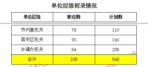从单位层级来看,乡镇办机关招录人数为本次招录大户,有54%的人员为乡镇办机关招录,其次为县市区机关,招录人数占25%,市州直机关招录人数最少,占20%。