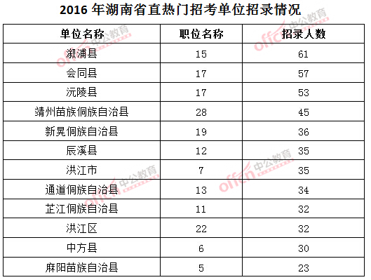 从招录单位来看,怀化多县招录人数相差不多,最多的溆浦县招录61人,仅占总人数的10%,个别单位仅招录1人,竞争依旧激烈。