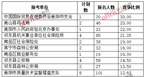 竞争热门招考单位,前三位依次是:中国国际贸易促进委员会衡阳市支会、衡山县司法局、衡阳市人民政府驻北京办事处 ,竞争比例依次为30:1,23:1和22:1。