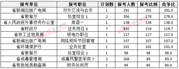 竞争热门职位,前三位依次是:省新闻出版广电局对外交流与合作、省教育厅处室综合1和省人民政府外事侨务办公室英语一,竞争比例依次为291:1、178:1和138:1。
