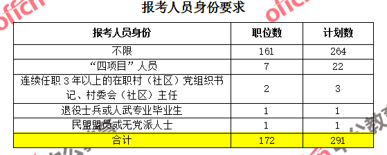 本次招录有93.6%的职位不限招考对象,其余职位对报考人员的身份要求划分得非常细致。““四项目”人员、“连续任职3年以上的在职村(社区)党组织书记、村委会(社区)主任”均占一席之地。中公教育专家提醒大家一定要看清楚自己的身份是否符合所选职位。