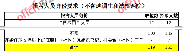 本次招录有84.03%的职位不限招考对象,其余职位对报考人员的身份要求划分得非常细致。““四项目”人员、“连续任职3年以上的在职村(社区)党组织书记、村委会(社区)主任”均占一席之地。中公教育专家提醒大家一定要看清楚自己的身份是否符合所选职位。