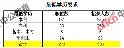 湖南广纳各种学历的人才,上至博士研究生,下至高中毕业生,都有其用武之地。据统计,要求本科学历的招录人数占46.14%,要求专科学历的招录人数占47.86%。专科学历占大头,低学历的人员也有机会参与竞争。