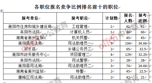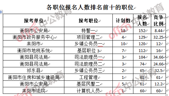 为帮助广大考生更清晰的了解报名情况,中公教育整理了衡阳市各职位的报名人数排名以及竞争比例排名,供广大考生参考: