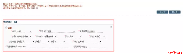 九、填写教育及培训情况,学校、毕业日期、类别、学习形式、学历、学位、专业、学制、毕业证书编号等信息,以上内容严格按照毕业证上填写,确认无误后点击右上角下一步。